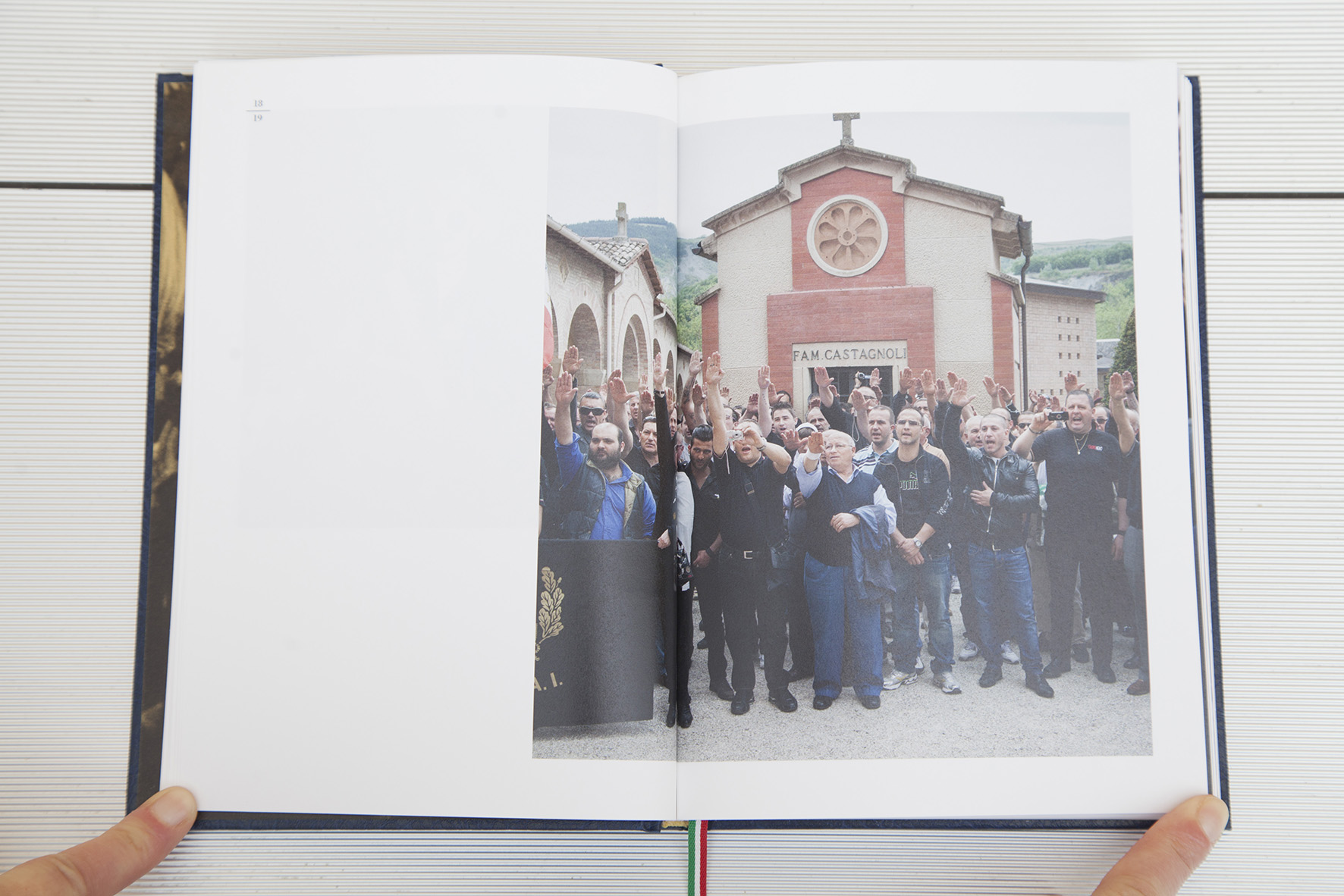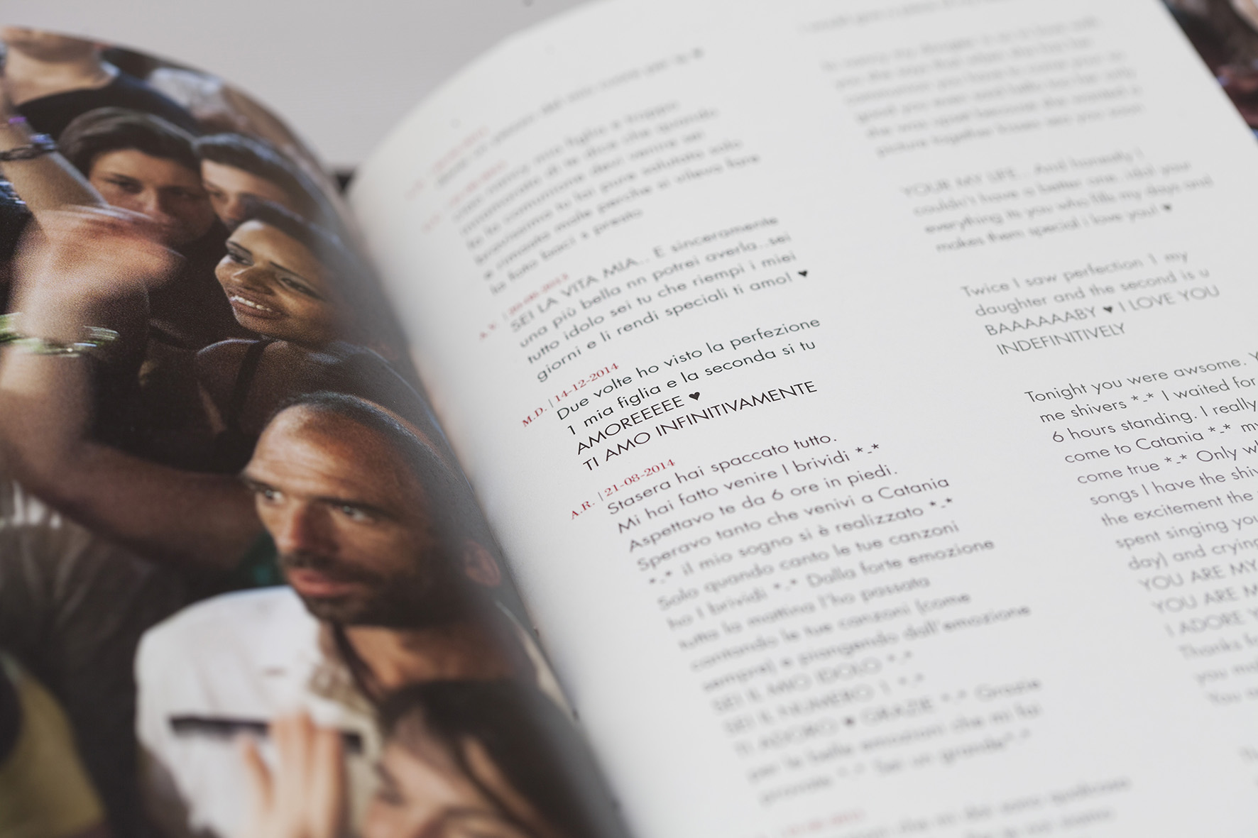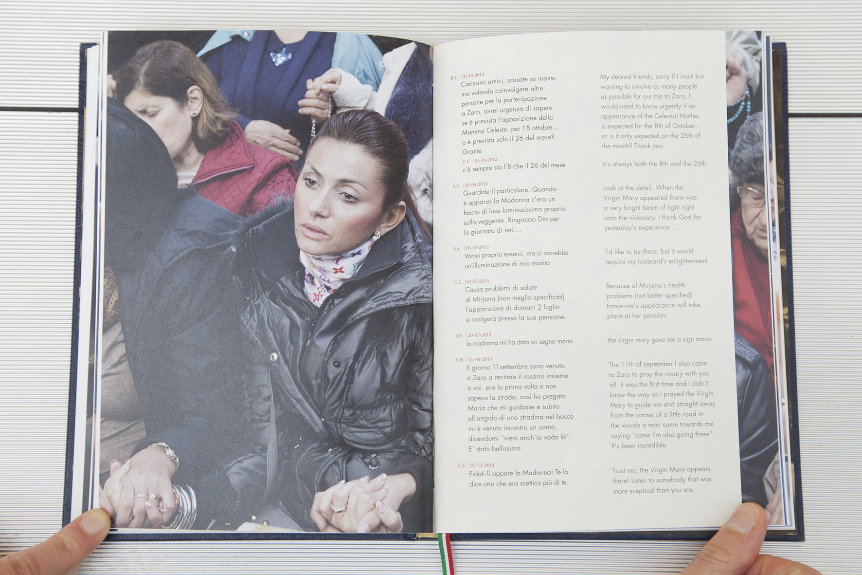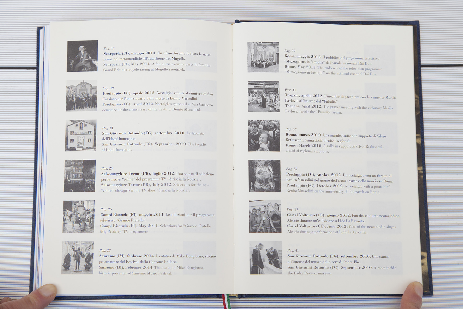 “Dall’inizio del 2009 mi sono interessato a fenomeni di massa dove comunità eterogenee mostrano comportamenti simili tra di loro. Attraversando la penisola alla ricerca di miti e icone dell’immaginario contemporaneo e partecipando a eventi tra i più disparati, ho capito come il mio paese fosse il posto più grottesco, divertente, ingenuo ed esaltato dove poter vivere e fotografare. Ho cercato quello che spinge le persone ad aggregarsi per perseguire un interesse personale, che nella rappresentazione su palchi, reali o