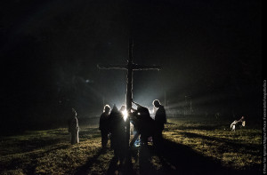Abbiamo partecipato a diversi raduni. Durante il primo ho assistito al rito dell’ accensione della croce, in una zona rurale del Maryland, lo stato da cui provengo. Il KKK si era vantato che decine di appartenenti al Klan sarebbero intervenute alla cerimonia, ma c’erano solo poche persone quando siamo arrivati, tra cui una troupe televisiva inglese e un fotografo freelance. Dopo essersi giustificati con un paio di scuse vaghe riguardo la poca affluenza, i membri del Klan hanno indossato la toga ed iniziato il raduno. Dopo aver sistemato un amplificatore, uno dei leader ha cominciato a inveire contro le Nazioni Unite, sostenendo che stavano cospirando con la FEMA (Federal Emergency Management Agency) con lo scopo di ospitare campi di addestramento ISIS i cui combattenti avrebbero poi sotratto le armi agli americani. Questo piano sarebbe stato ordito da Barack Obama (o Barry Soetoro come viene chiamato dal Klan. Soetoro era il cognome del patrigno di Obama e il fatto che sia stato chiamato per breve tempo Barry Soetoro durante le scuole elementari, è stato usato come prova che Obama non è nato in America). Dopo aver finito di sbraitare, il membro del Klan dalla voce rauca ha bruciato la bandiera delle Nazioni Unite e l’ha calpestata, tra le tiepide acclamazioni provenienti dalla piccola folla.