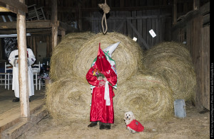 Il raduno più interessante a cui abbiamo partecipato è stato il matrimonio di due membri del Klan. Entrambi vantavano diverse generazioni di antenati appartententi al Klan e desideravano portare avanti una tradizione di famiglia. Il matrimonio ha avuto luogo in una casa nel profondo Tennessee rurale. Quando siamo arrivati ​​la sposa e lo sposo si sono recati per il pranzo di nozze da Arby, un ristorante fast food. Lo sposo ha avuto diversi infortuni sul lavoro che hanno compromesso la sua abilità al lavoro manuale e la certezza di un impiego stabile; il che ha costituito grande fonte di rabbia e risentimento. Sebbene egli abbia accusato i neri e gli immigrati di sottrargli le opportunità di lavoro, Vegas (lo scrittore norvegese con cui ho lavorato) ha rimarcato il fatto che le minoranze economicamente emarginate hanno avuto gli stessi suoi problemi, e che la sua rabbia dovrebbe essere causata da una questione di classe più che di razza. Dopo pranzo ci siamo diretti di nuovo verso il fienile e la cerimonia è iniziata. Lo sposo indossava un abito bianco e la sposa uno rosso lucido. Hanno drappeggiato il loro cane, Leroy, con una piccola tunica del Klan con attaccato un pezzo di stoffa recante la scritta “Potere Bianco”. Il matrimonio è stato celebrato in un fienile di fronte a un piccolo tabernacolo.